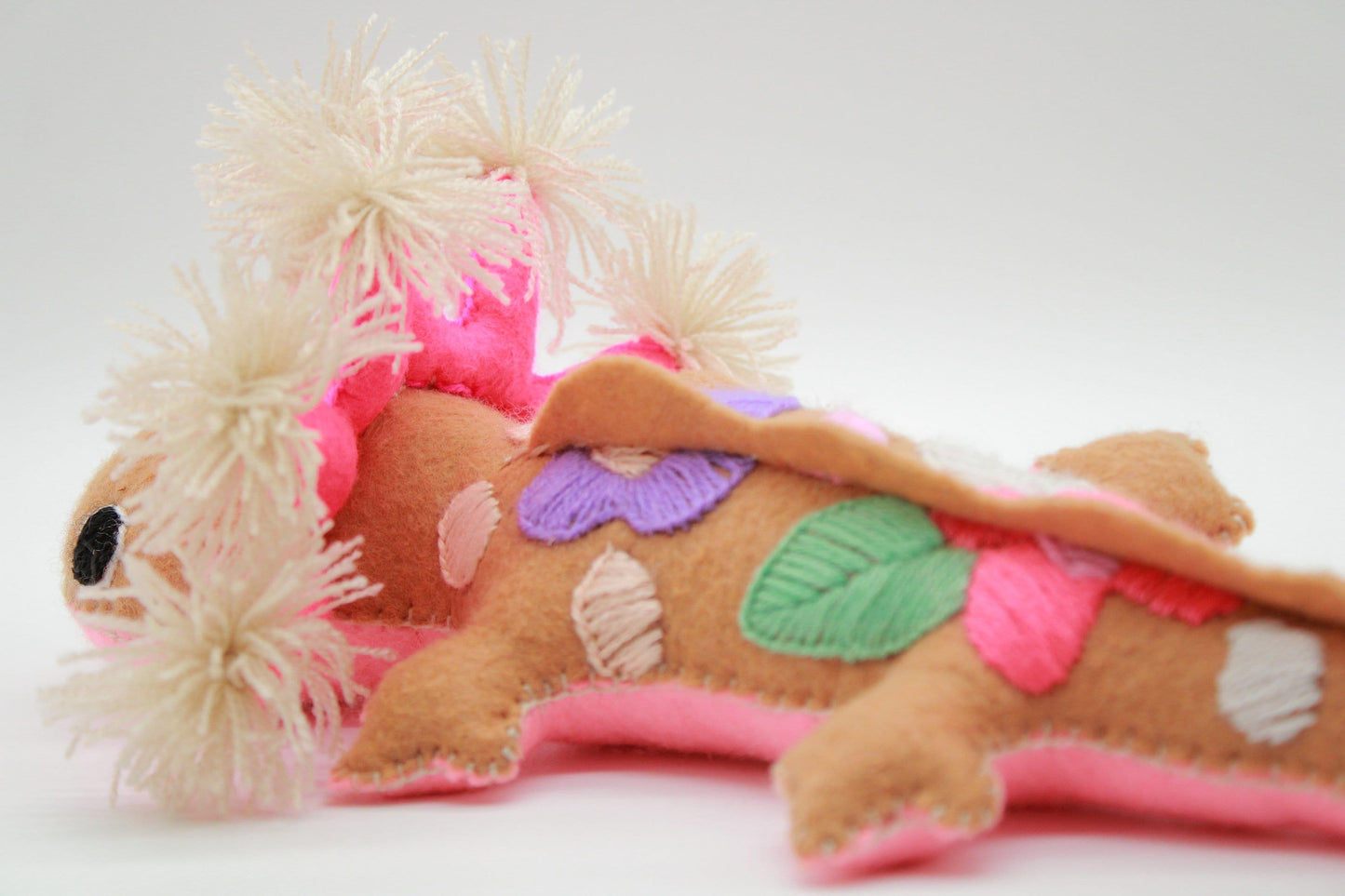 Niedlicher bunter Kuscheltier-Axolotl mit einem schönen handgemachten Design aus 100% natürlicher Wolle. Die Kuscheltiere werden in Chiapas, Mexiko von Frauen von Hand gefertigt. Ein schönes Geschenk zum Geburtstag für jedes Kind, Mädchen wie Junge.