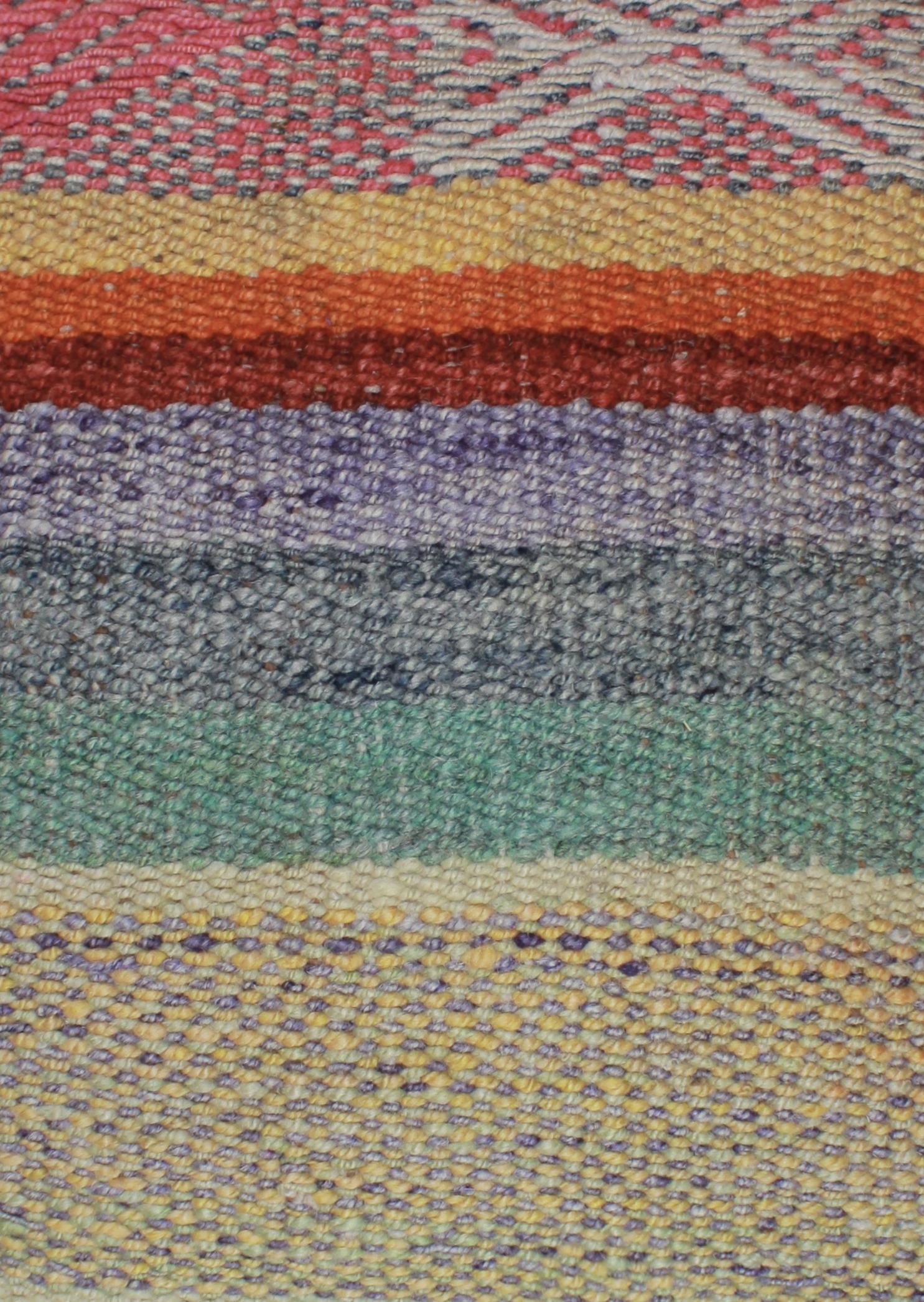 Vorder- und Rückseite bestehen aus 100 % Schurwolle. Die Rückseite ist einfarbig in Marfil gehalten. Die Farben entstehen durch natürliche Pigmente aus Pflanzen, Samen und Insekten, wie die Schildlaus.